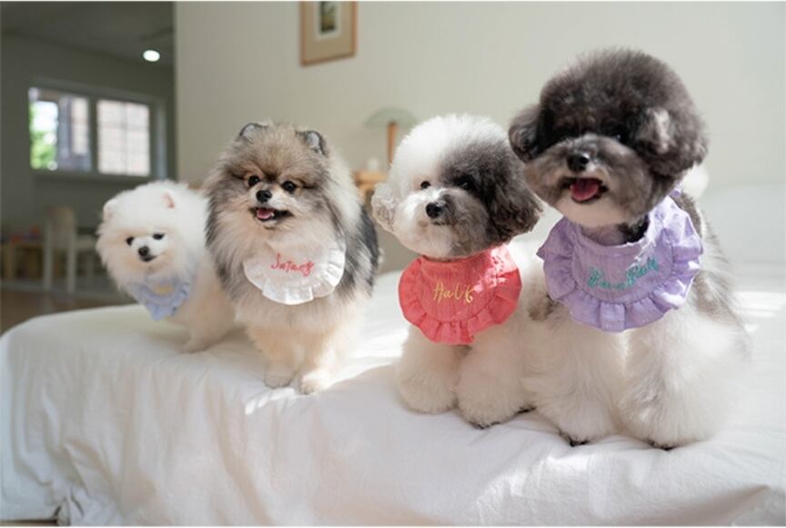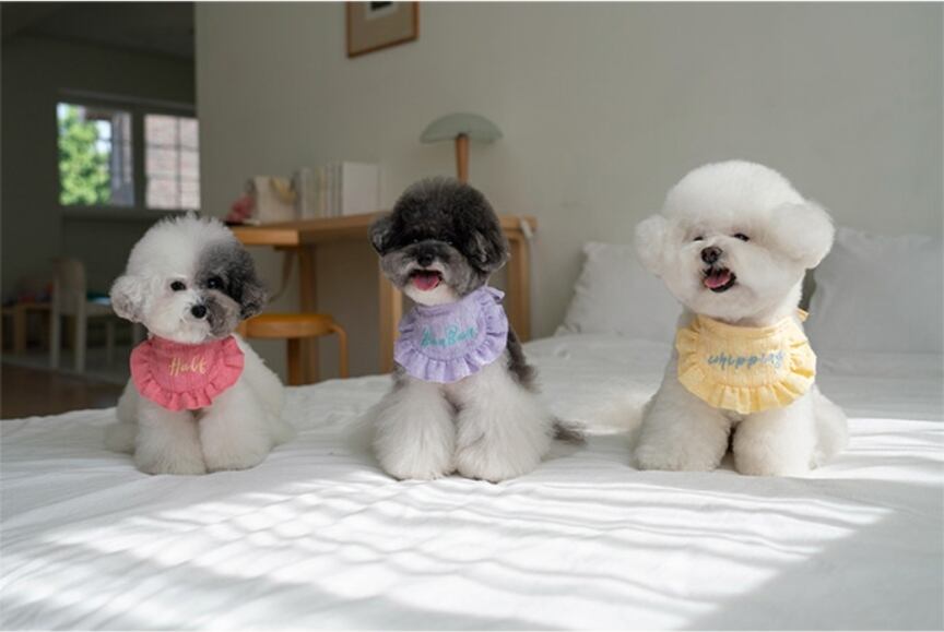 服を着るのが難しいワンちゃんたちにも軽くチャームポイントになるように、犬用のビブはバラバラにコレクションする楽しみもあり、友達と一緒に犬服に合わせやすいアイテムとしておすすめです^^