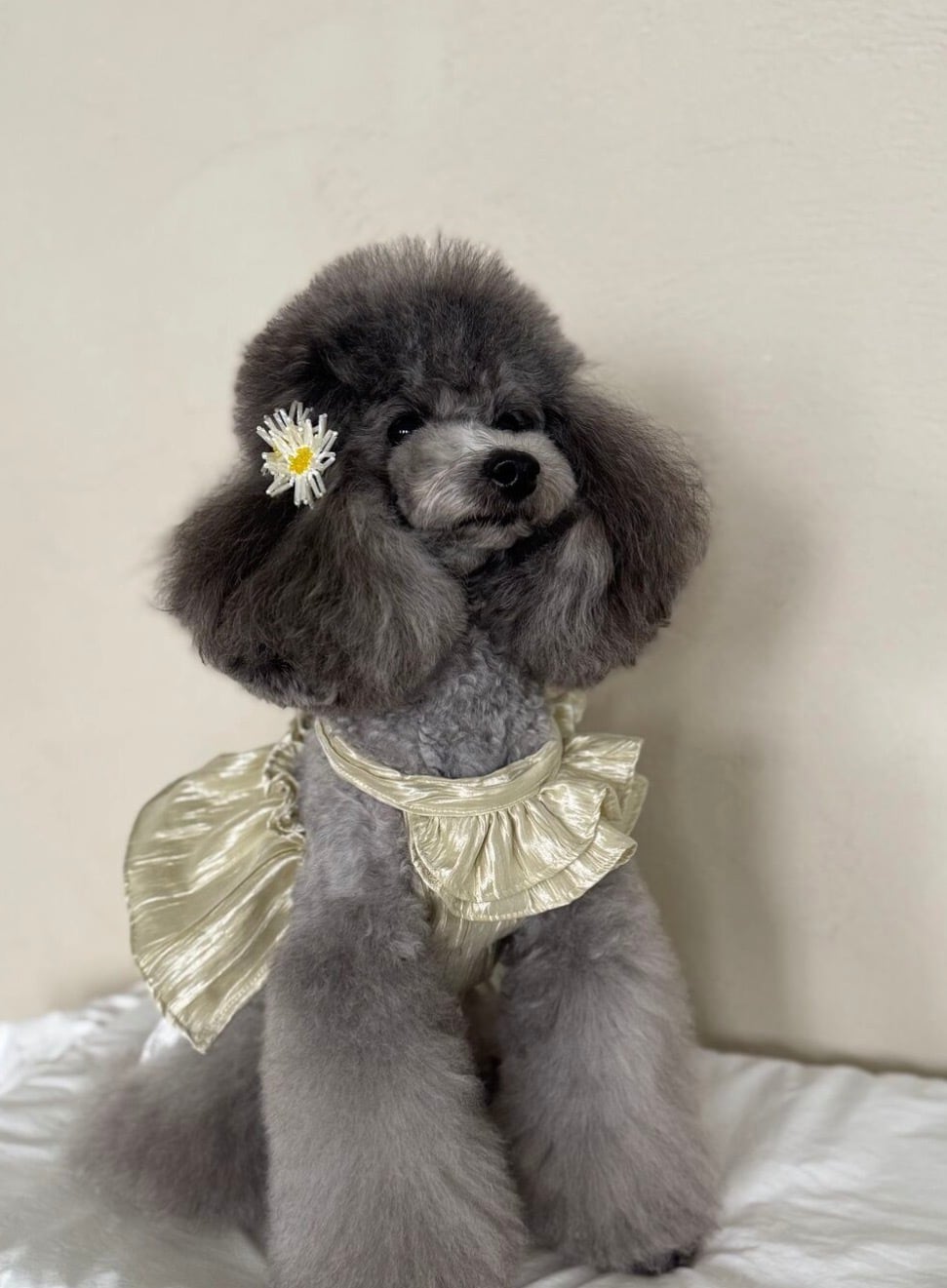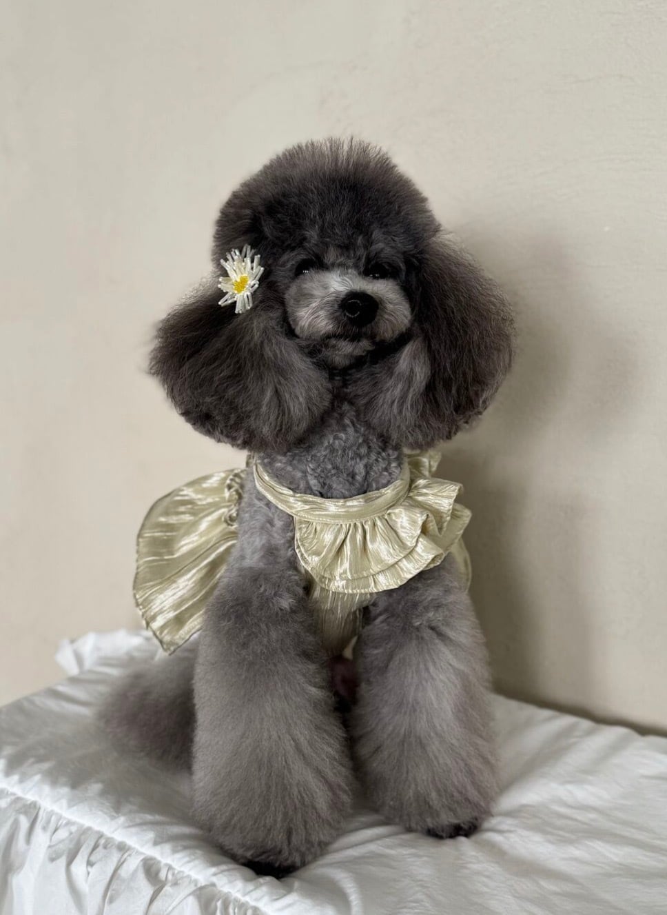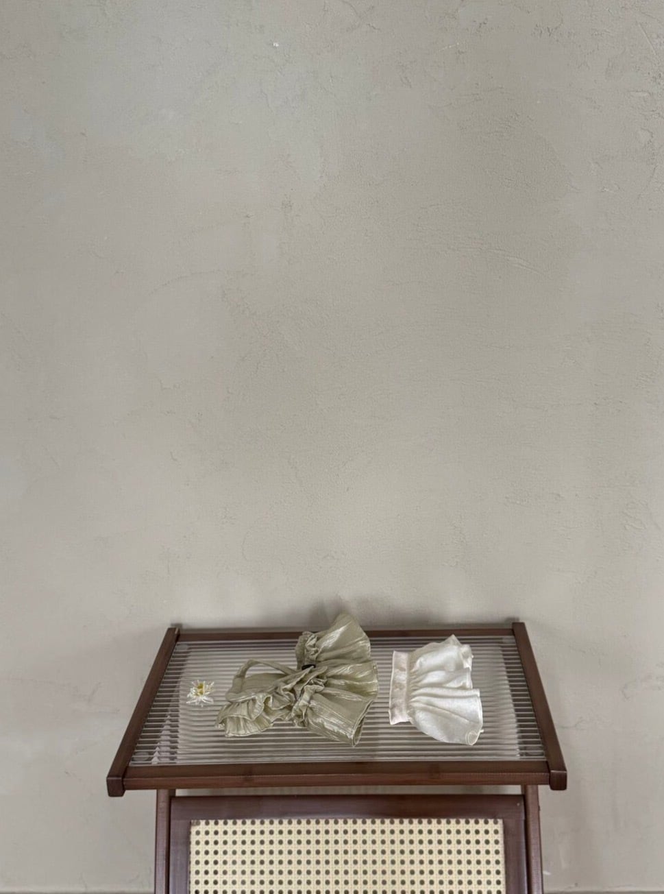 素材特有のシルキーな質感と自然にできたプリーツが調和し、軽やかで柔らかな雰囲気を演出します。