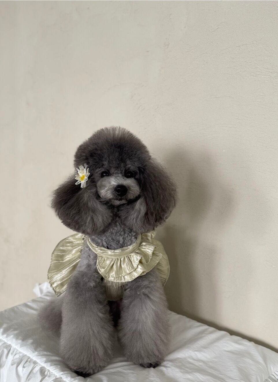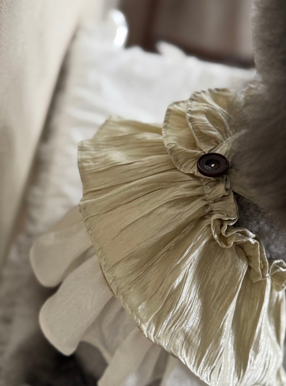 中央にはポイントボタンを加え、全体デザインの中心をしっかりと保ち、前のネックラインも二重フリルで可愛らしい印象を強調しています。