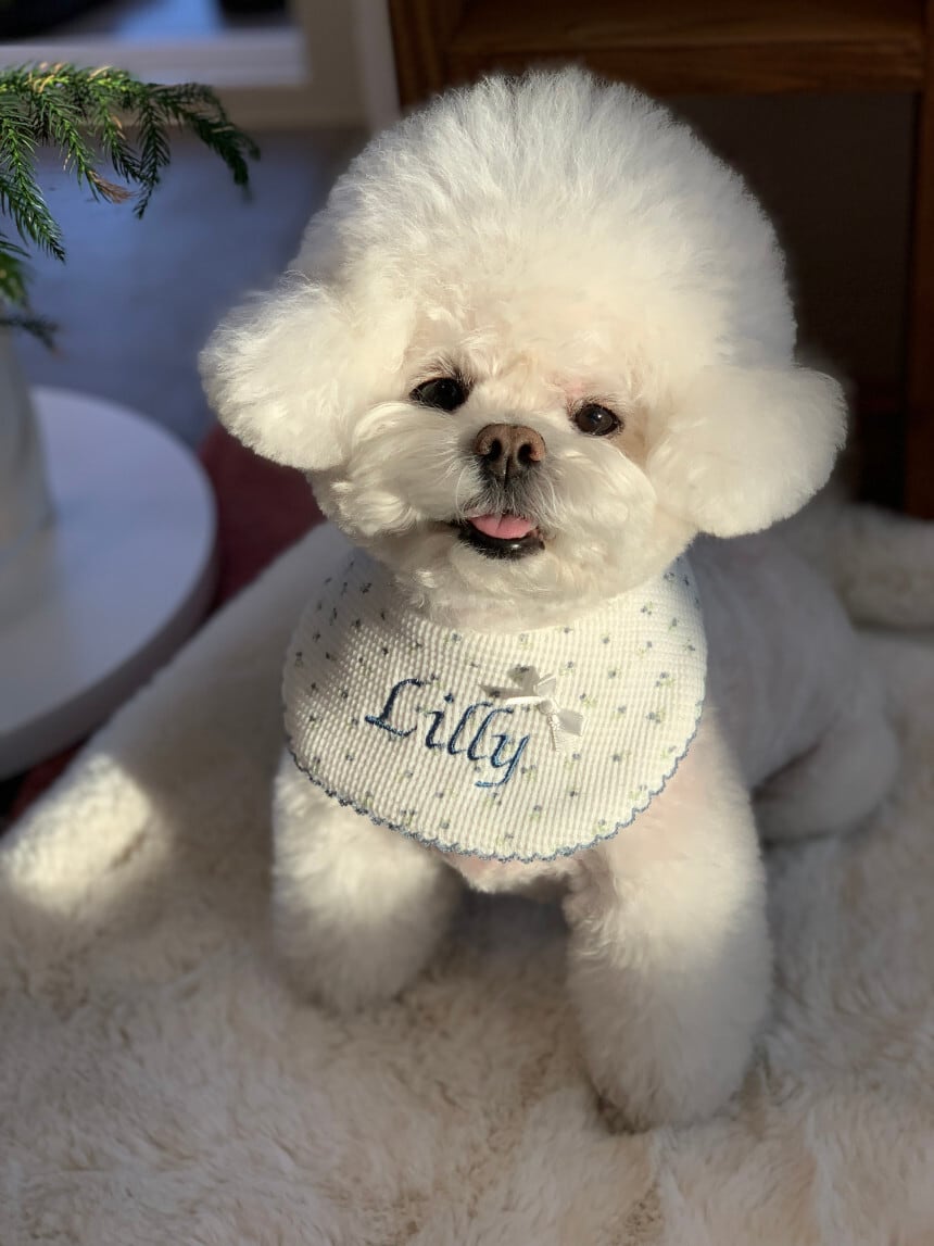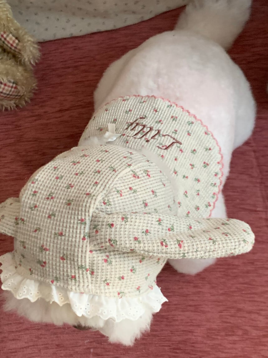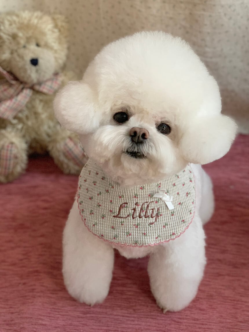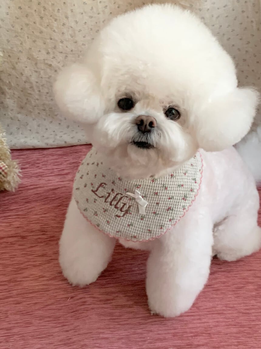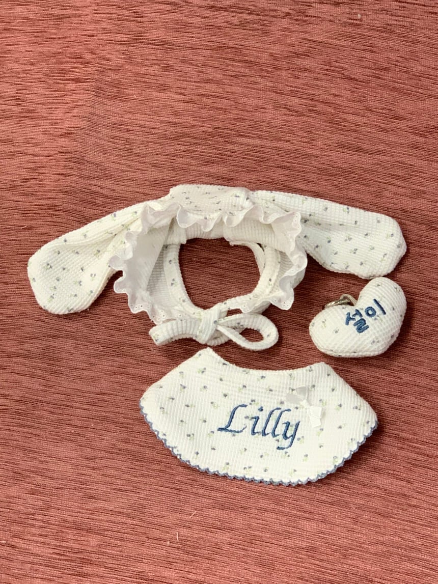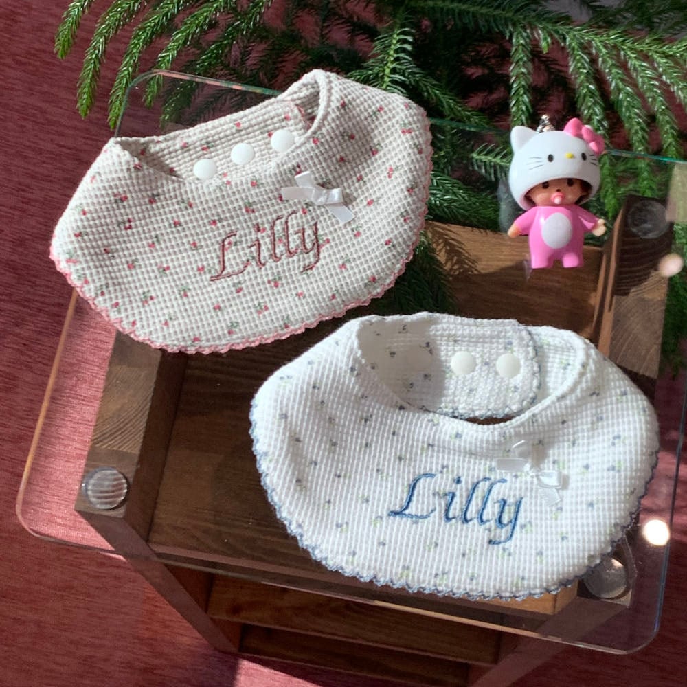 毎日のコーデにそっと寄り添うネームビブです。韓国ハンドメイドブランド settu settu より、やさしい雰囲気の小花ドットが可愛い